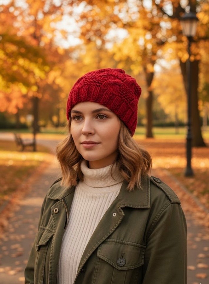 Koyu kırmızı renkli, örgü dokulu kadın bere, sıcak tutar ve trend sokak stiline uygundur. Rahat ve şık bir tercih.