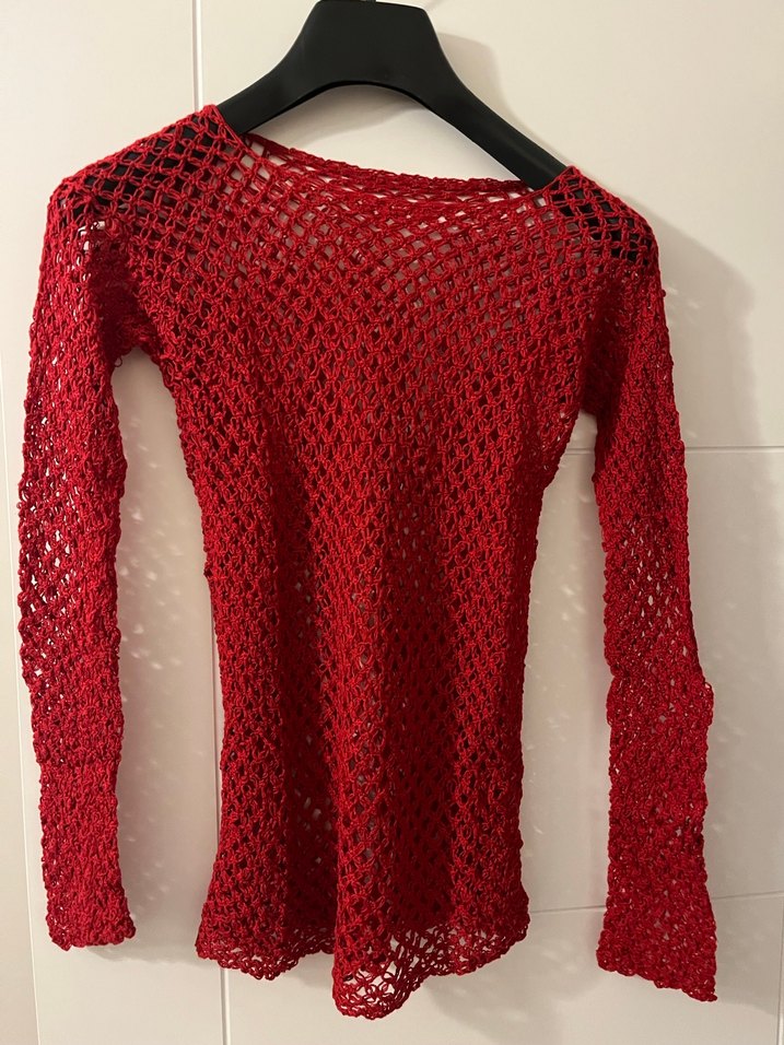 Koyu kırmızı örgü, uzun kollu, bisiklet yaka ve midi boyda, vücuda oturan bohem tarzda kadın kazak. Rahat ve şık bir görünüm sunar. File kazak