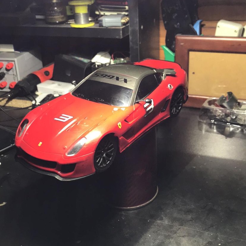 Koyu kırmızı renkte oyuncak araba, siyah tekerlekleri ve sportif tasarımıyla dikkat çekiyor.