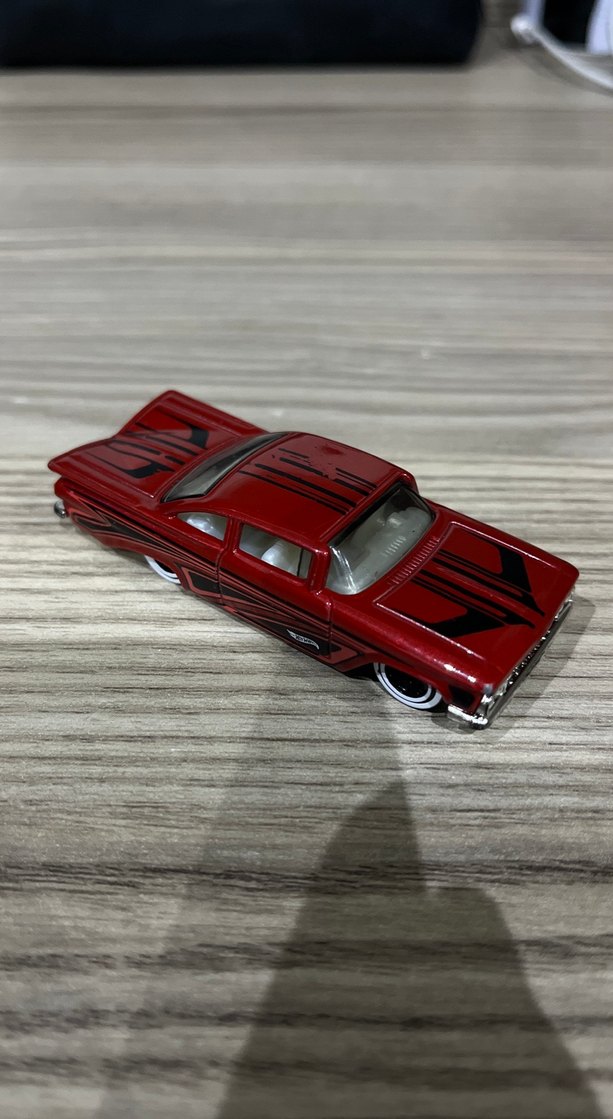 Koyu kırmızı renkte, siyah yarış çizgilerine sahip detaylı oyuncak araba. Beyaz jantlı tekerlekleri ve klasik tasarımı bulunur.