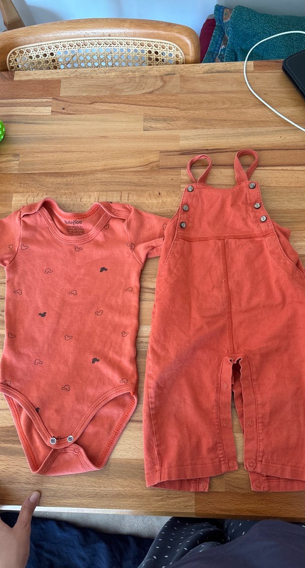 Koyu kırmızı pamuklu, ayarlanabilir askılı düğmeli erkek bebek salopet ve kalp desenli kolsuz body. Rahat ve şık.