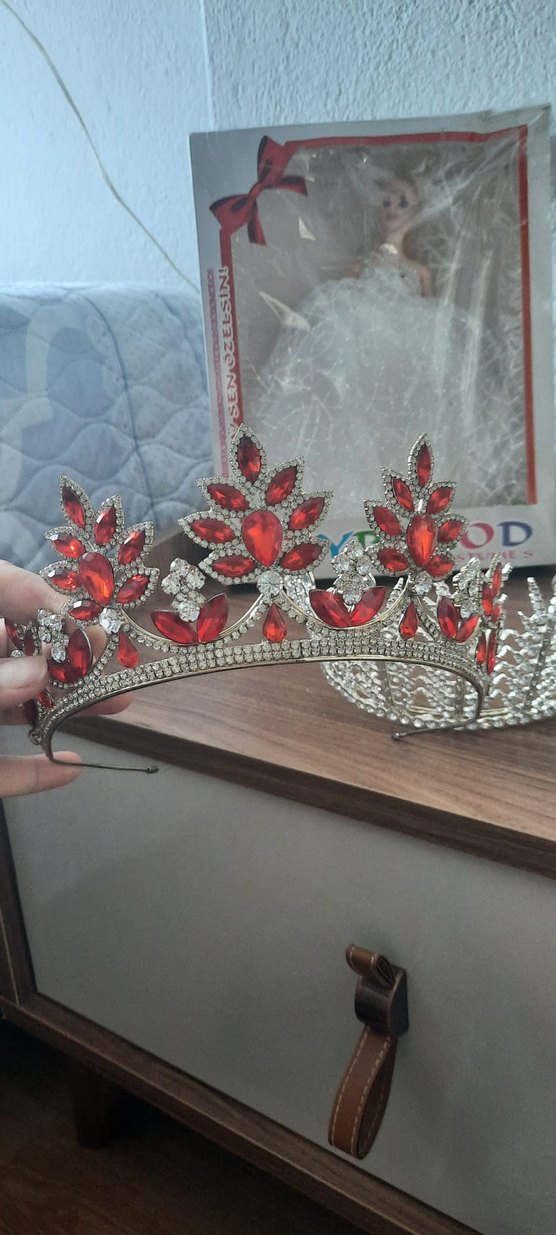 Koyu kırmızı cam taşlar ve payet detaylarıyla süslenmiş, geleneksel tarzda, bohem ve retro esintili gösterişli taç. Düğün için sadece bir kere kullanılmıştır.