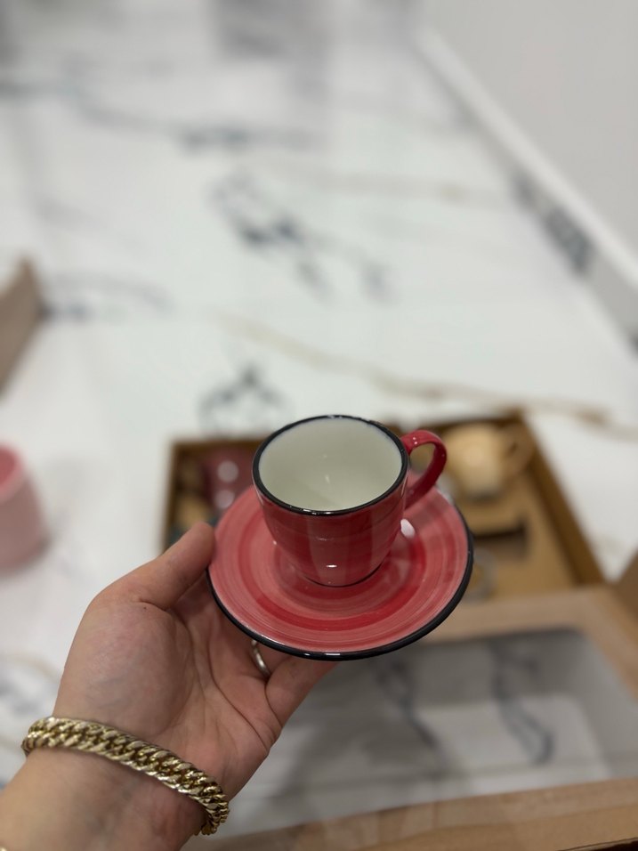 Renkli porselen fincan ve tabağı, pürüzsüz yüzeyi ve rahat tutma sapıyla sıcak içecekler için uygundur. ☕