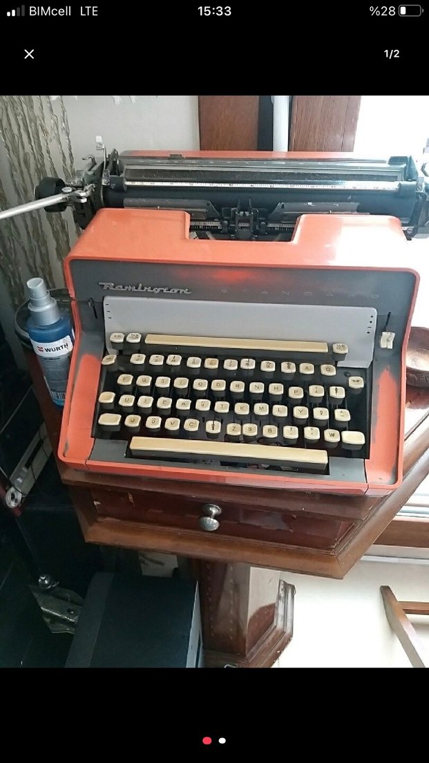 Koyu kırmızı renkli Remington daktilo, vintage tuşlara ve sağlam yapıya sahiptir. ️