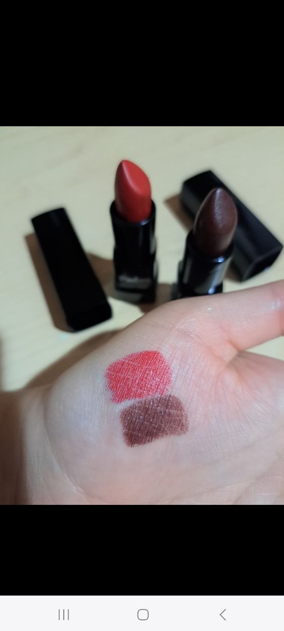 Koyu kırmızı renkte, zengin renk ve yumuşak dokulu ruj. El üzerinde renk örnekleriyle gösterilmiştir.Kırmızı var sadece