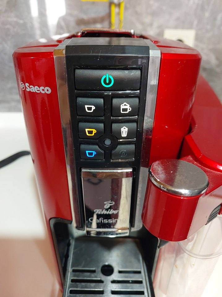 Koyu kırmızı renkli Saeco kahve makinesi, farklı kahve türleri için çoklu düğmeler ve metal çıkışa sahiptir. Kompakt tasarımlıdır. ☕