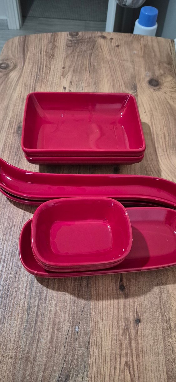 Koyu kırmızı seramikten yapılmış, farklı dikdörtgen şekillerde kahvaltı seti. Yemek servisi veya saklama için uygundur. ️