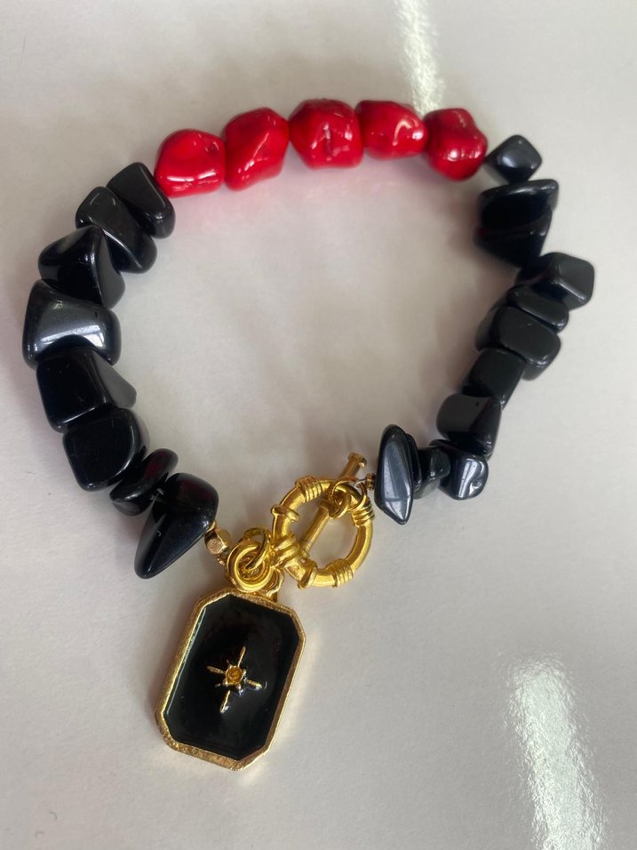 Kadın bilekliği, koyu kırmızı ve siyah boncuk taşlardan oluşur. Etnik desenli, altın renkli bir charm ile gotik ve cesur tarz için uygundur.