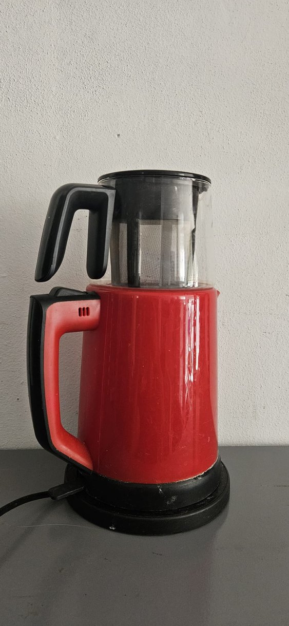 Koyu kırmızı renkte, su ısıtıcılı ve entegre demlikli çay makinesi. Sağlam sapı ve kompakt tasarımı vardır.