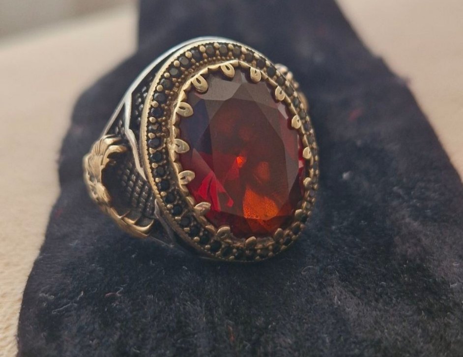 Koyu kırmızı taşın çevresinde detaylı vintage tarzı işlemeler bulunan erkek yüzüğü, bohem ve retro bir hava sunar.