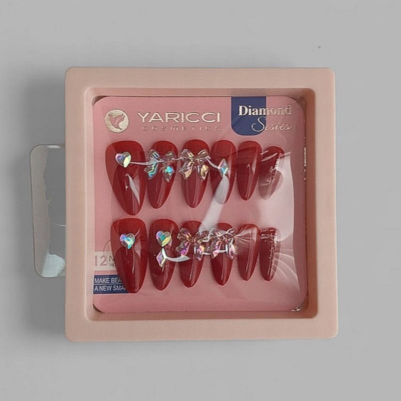 Yaricci markasına ait, parlak taş detaylı koyu kırmızı tırnak süsleri.