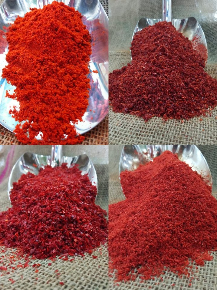 Farklı dokularda koyu kırmızı toz baharat seti, yemeklere zengin renk ve lezzet katmak için uygun. ️