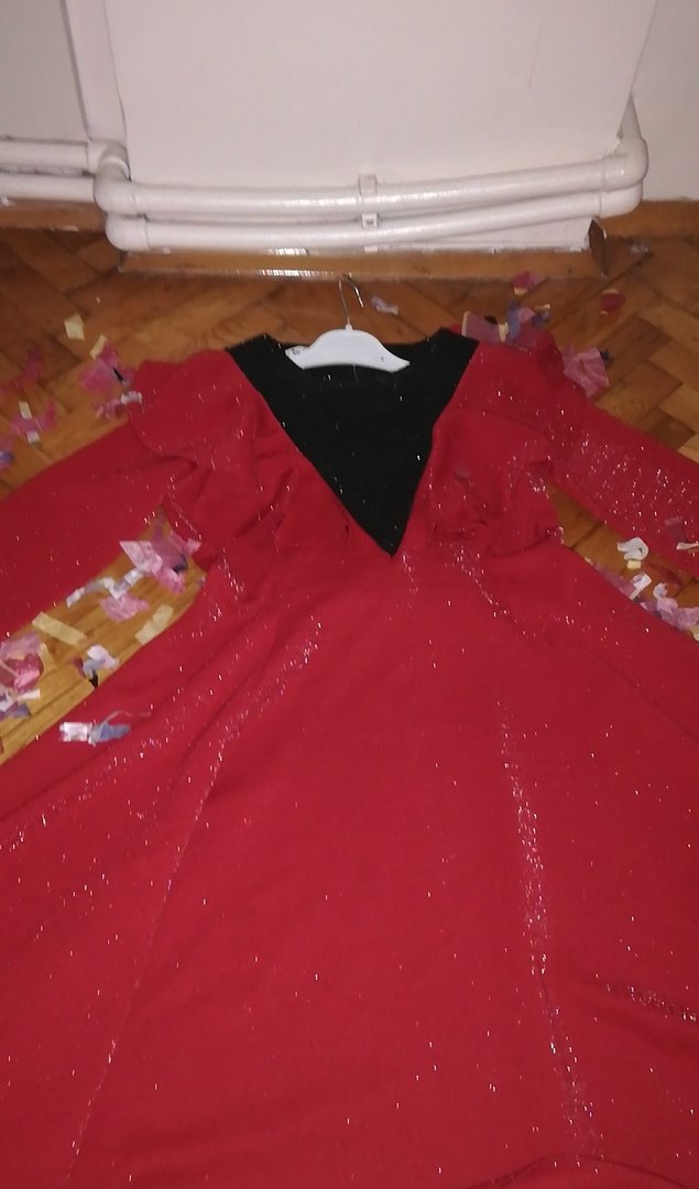 Koyu kırmızı renkte, V yaka ve uzun kollu, bol ve drapeli kesime sahip kız çocuk abiye elbise.