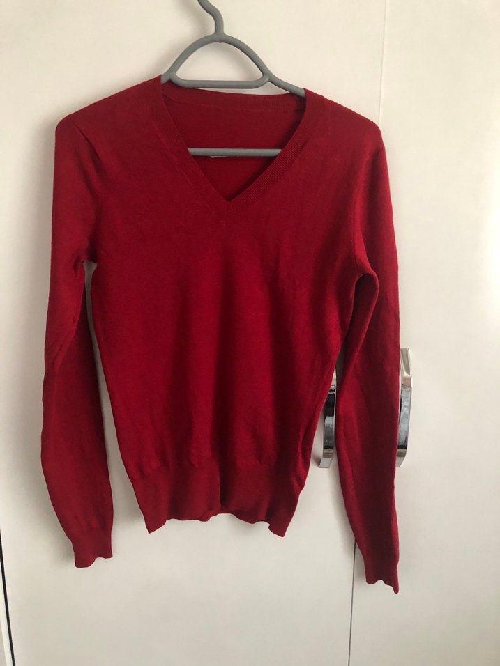 Koyu kırmızı, V yakalı ve uzun kollu kadın kazağı, yumuşak yünden örülmüştür. Günlük kullanıma uygun, rahat ve normcore tarzda, vücuda oturan modeldir.