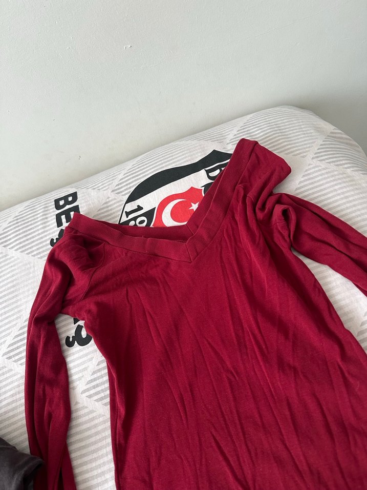 Koyu kırmızı renk, V yakalı ve uzun kollu, triko dokuma pamuk hamile tişörtü. Günlük rahat kullanıma uygundur.