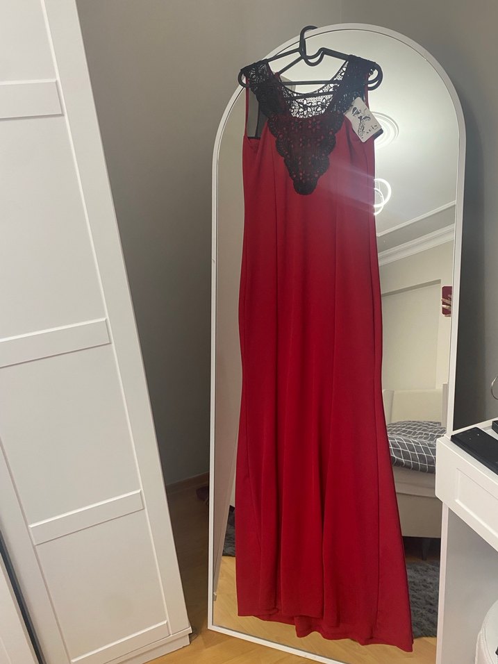 Koyu kırmızı renkte, v yakalı ve drapeli uzun, fitted abiye elbise. Kolsuz ve goth tarzında, romantik akşamlar için uygun, desensiz şık bir model. Hiç kullanılmadı etiketi üzerinde xl beden ama l ve m bedene de uyar