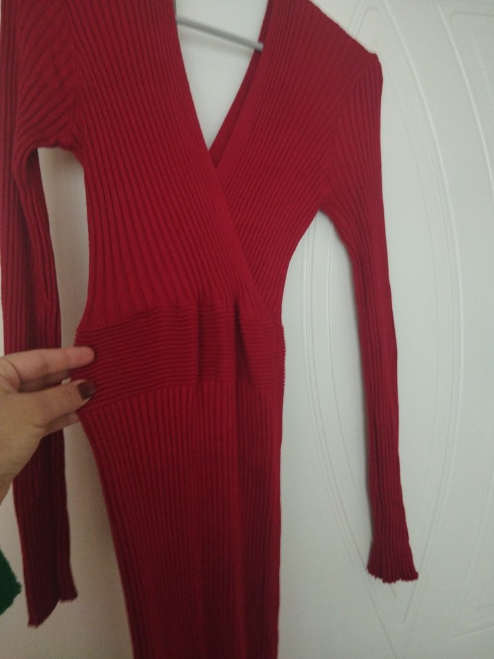 Koyu kırmızı renkte, V yakalı, uzun kollu ve uzun boylu triko elbisedir. Fitted kesimi ve desensiz yapısıyla modern ve rahat bir görünüm sunar. midi boy