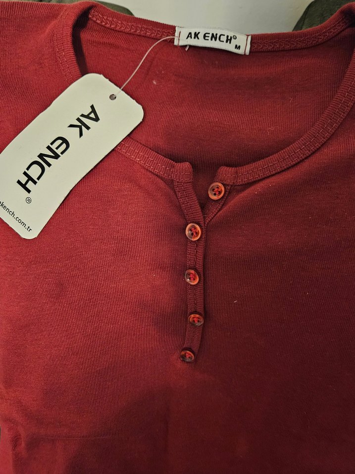 Düğmeli, düz tasarımlı koyu kırmızı vintage tarzı . yüzde yüz pamuklu. esnek. Marka etiketi AK ENCH yazılıdır.