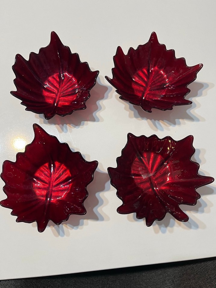 Ev dekorasyonuna uygun, yaprak şeklinde koyu kırmızı renkte dört adet dekoratif tabak seti.