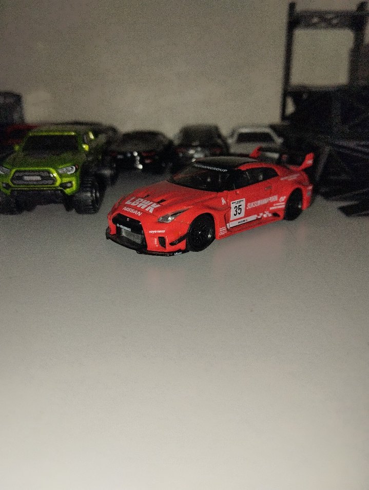 Koyu kırmızı renkte, detaylı çıkartmalar ve arka spoyleri olan yarış tasarımlı oyuncak araba.