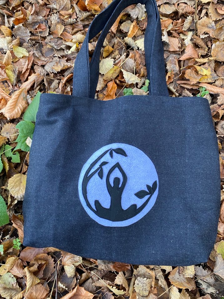 Keçe yoga desenli koyu mavi kot kumaştan yapılmış kadın çantası. Bohem tarzıyla günlük sokak modasına uygun.