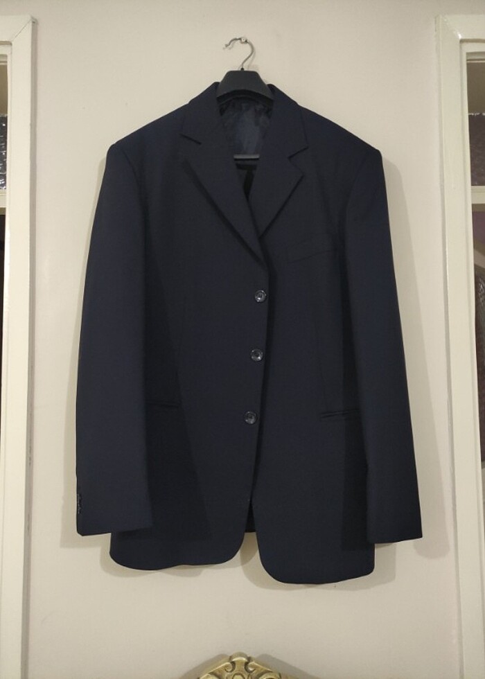 bir kere giyildi. yepyeni gibi sadece sağ kolunun bir düğmesi eksik. içinde astarı var. omuzlarında vatkalari var. önde sol göğüs ve alt sağ ve sol olacak şekilde önde 3 cebi var. içlerde de sağ ve sol olacak şekilde 2 cebi var.önü düğmelidir. Koyu lacivert rengi var.boyu 80cm. #ceket #blazer #düğün
