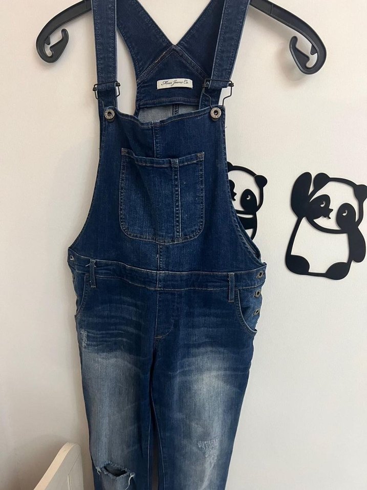Koyu lacivert, ince oturan denim uzun tulum, tokalı askılar ve bisiklet yaka ile midi boyda, gündelik ve sokak tarzı için uygundur. Bedeni standart beden M L uygun olur