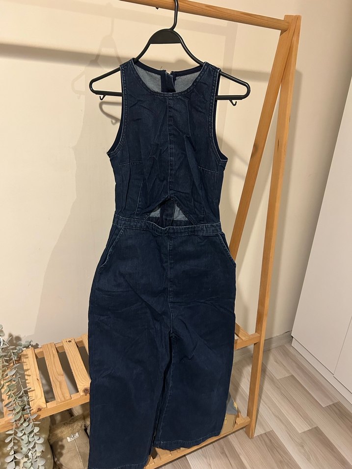 Koyu lacivert denim kumaştan, kolsuz, yüksek yakalı, kemerli ve vücuda oturan midi tulum.