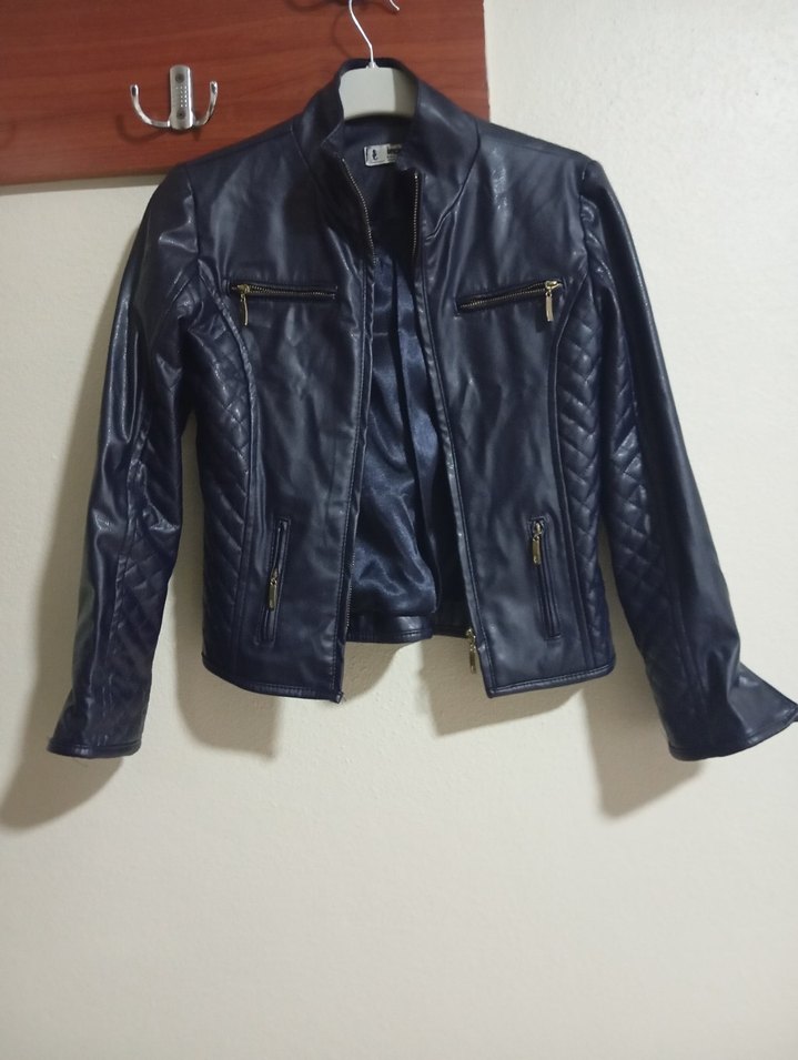Koyu lacivert deri, fitted biker ceket. Notched lapel, tokalı detaylar ve normal boy, günlük sokak tarzı için ideal.