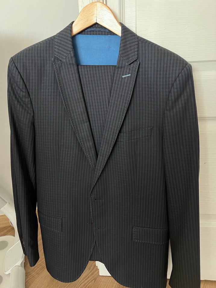 Koyu lacivert renkte, düğmeli ve normal kesim erkek takım elbise. Ofis kullanımı için uzun kollu, klasik ve çağdaş tarzda tasarlanmıştır. ️