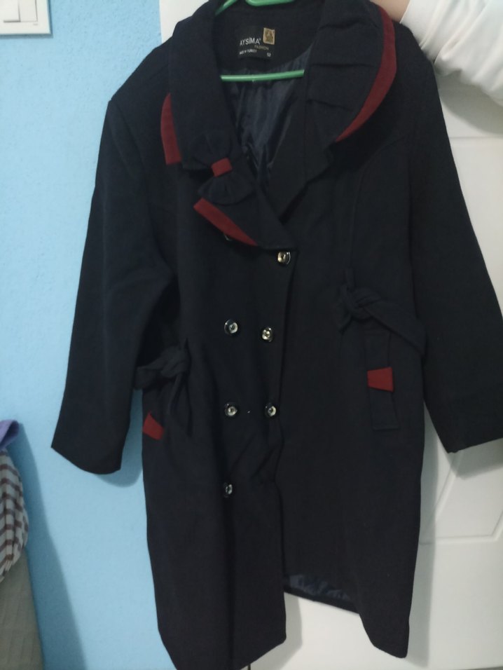 Bordo detaylı koyu lacivert kaban, çift düğmeli ve yan cepli. Soğuk havalar için yumuşak ve sıcak tutan kumaştan yapılmıştır.
