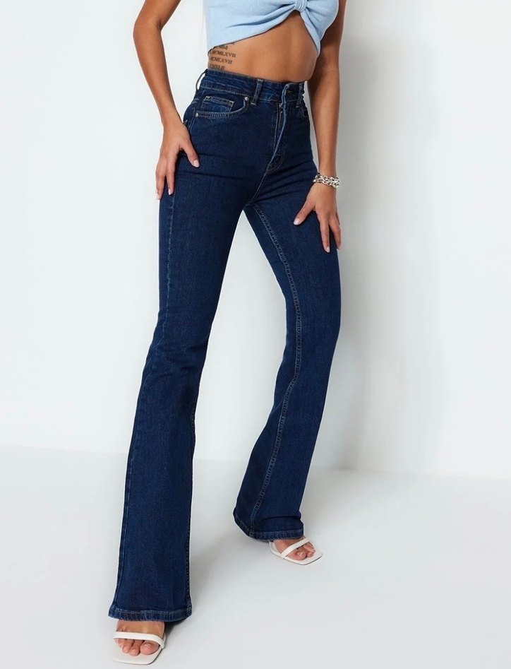Koyu lacivert renkte, normal boy ve esnek kesime sahip kadın denim jean. Günlük kullanım için rahat ve şık bir sokak stili sunar.