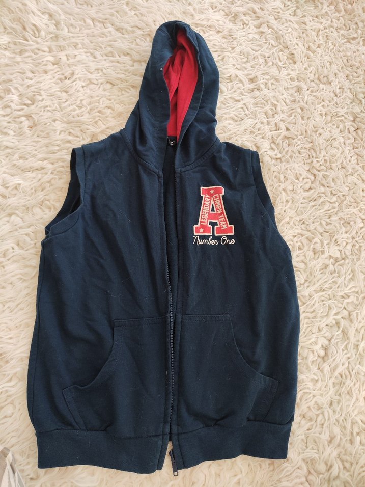 Kapüşonlu, fermuarlı, kolsuz erkek çocuk yeleği. Yumuşak ve sıcak kumaştan, kırmızı 'A' baskılı ve cepli.