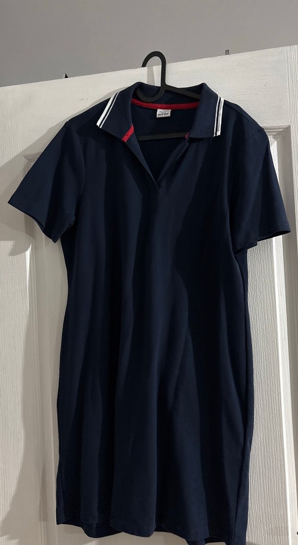 Koyu lacivert renkte, kemerli, kısa kollu ve polo yakalı, midi boyda elbise Rahat suni kumaştan üretilmiş, günlük sokak stili için uygundur.