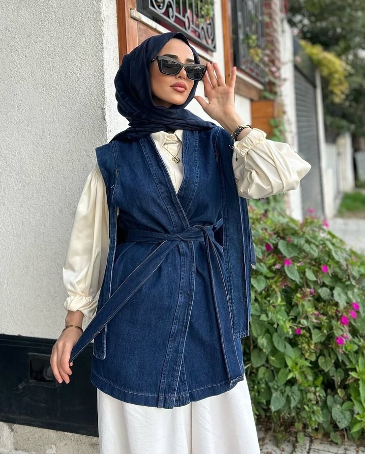 Koyu lacivert kolsuz denim ceket, regular fit, drapeli ve straplez yakalıdır. Midi boyda ve kemerli, sokak stiline uygun bir tasarıma sahiptir.