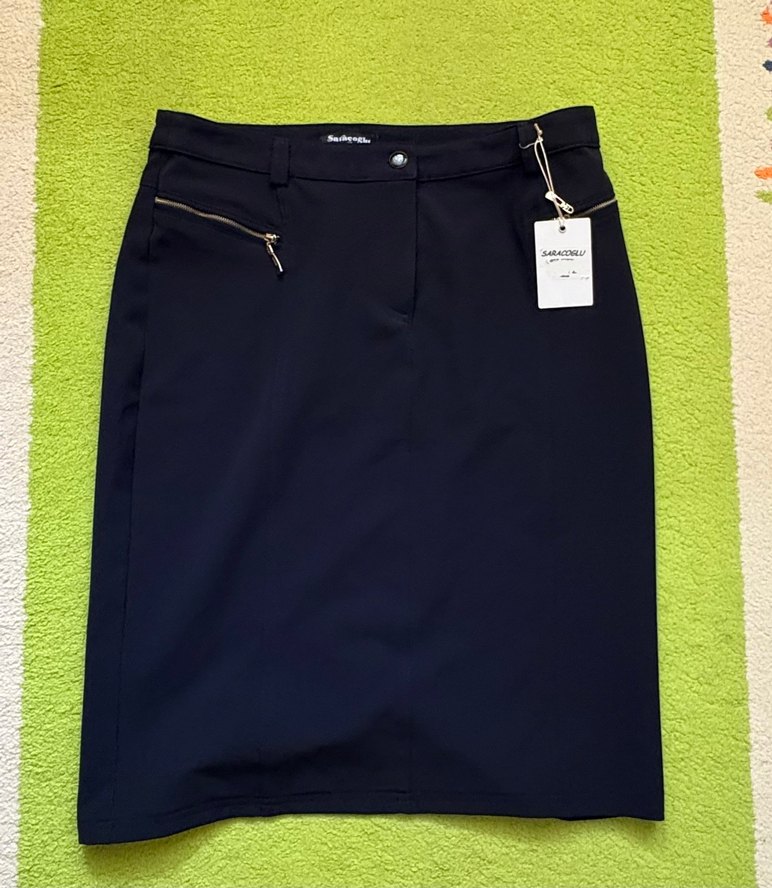 Siyah midi kalem etek, fermuarlı detaylara ve regular kesime sahiptir. Sentetik kumaştan üretilmiş olup ofis ve sokak stiline uygundur.