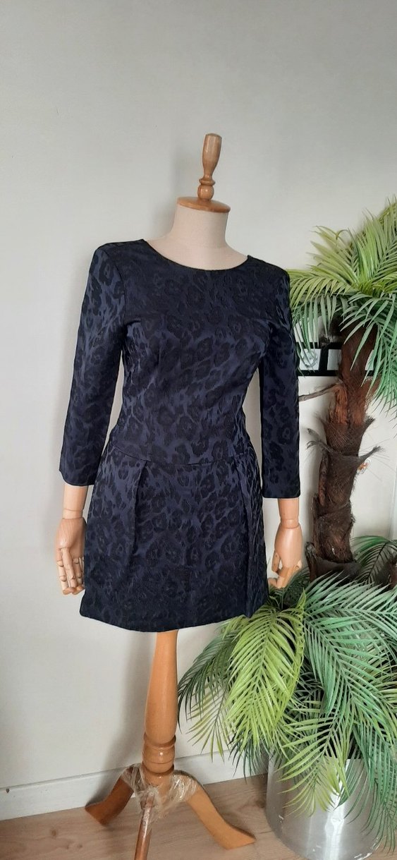 Koyu lacivert mini elbise, yuvarlak yaka, uzun kollu, yılan desenli ve kürk detaylı, ofis için uygun.