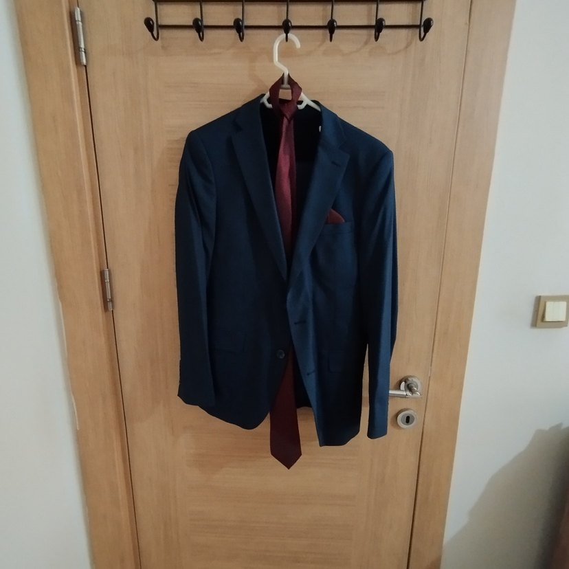 Koyu lacivert renkte, düğmeli ve normal boyda erkek takım elbisesi. Modern klasik tarzda, ofis için uygun, uzun kollu ve klasik yakalıdır. iki kez giyildi üründe hiçbir sorun yoktur. ölçüleri son fotoğraftadır.