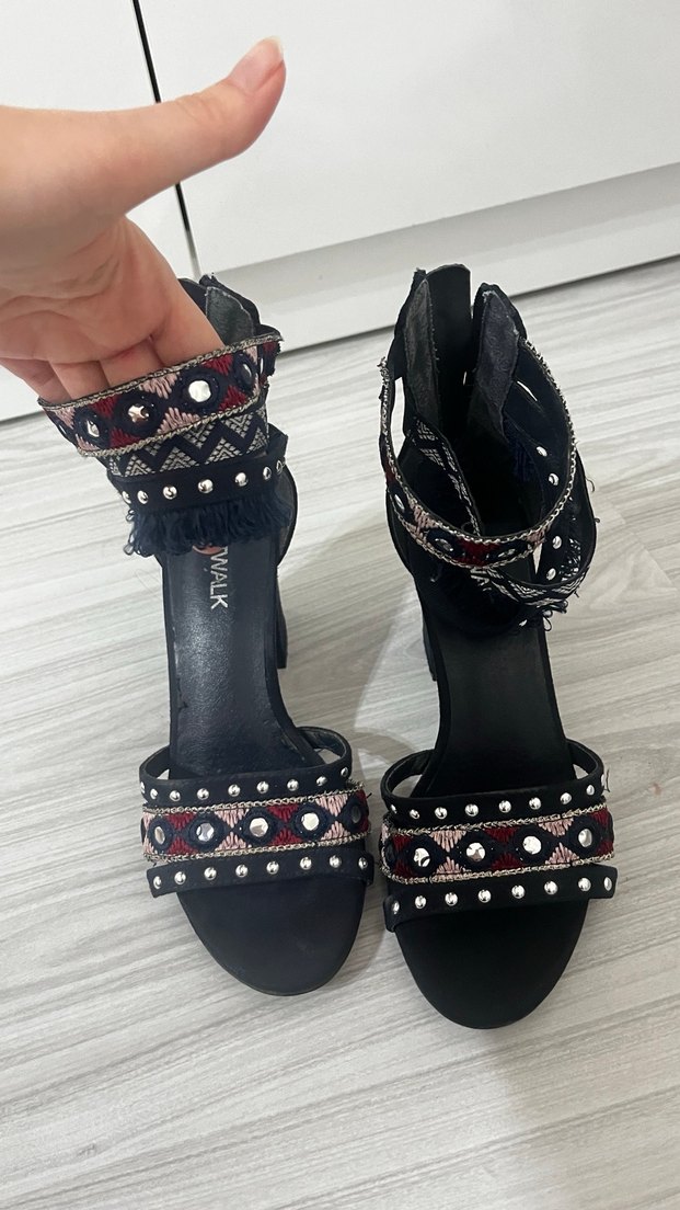 Koyu Lacivert blok topuklu ayakkabılar, nakışlı desenler ve tokalı detaylarla, kauçuk malzemeden. Romantik akşamlar için bohem tarzda.