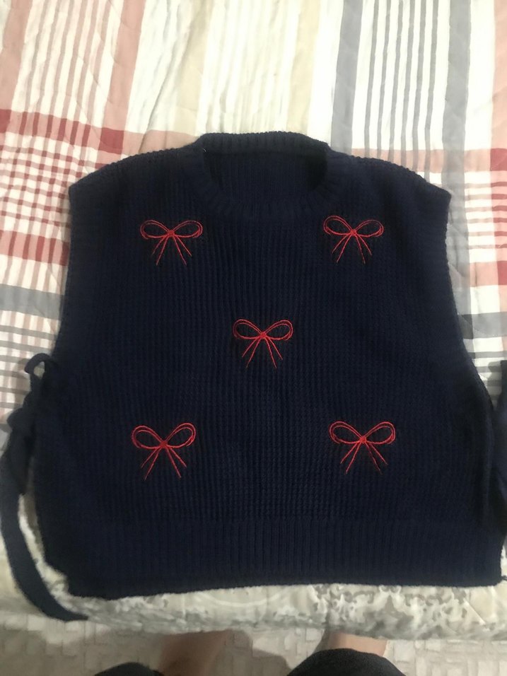 Koyu lacivert triko kumaştan, kırmızı nakışlı fiyonk desenleriyle süslenmiş, yakası yuvarlak, kolsuz ve normal boyda, rahat ve şık bir kadın süveteri. Yenidir.Hiç giyilmedi.