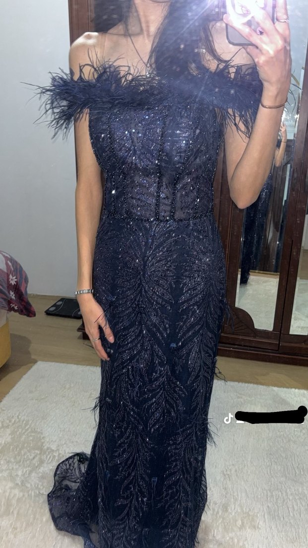 Koyu Lacivert Tüylü Straplez Uzun Elbise