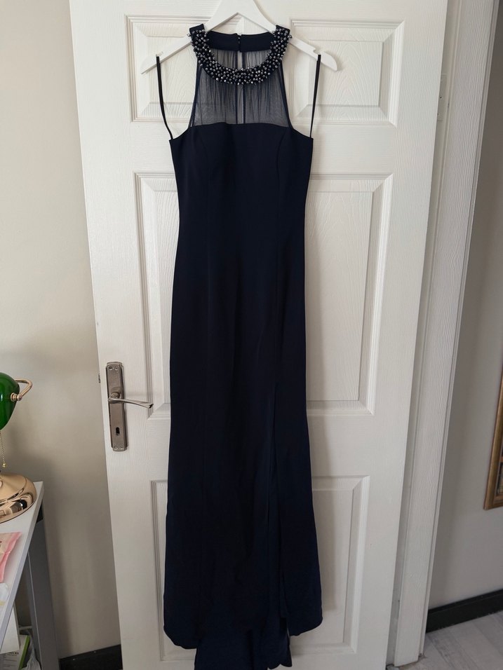Koyu lacivert renkte, drapeli ve yüksek yakalı, boncuk detaylı uzun, dar kesim kolsuz abiye elbise. Gotik tarzıyla romantik akşamlar için uygun.