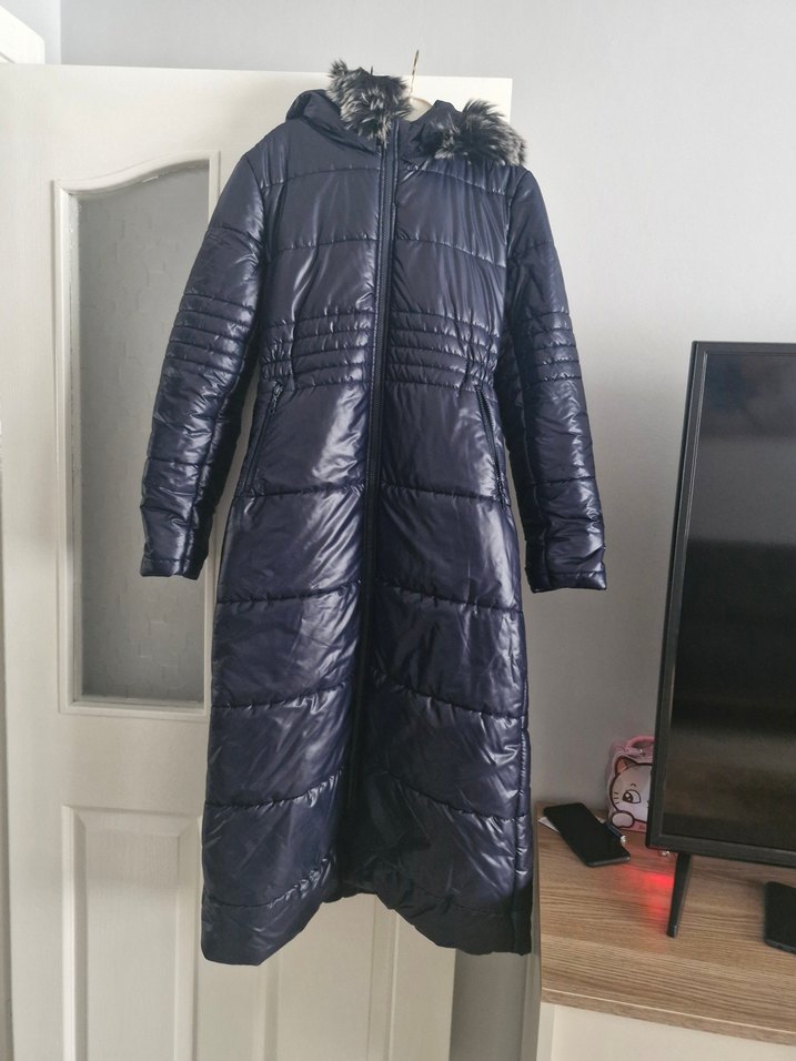 Koyu lacivert renkte, sentetik kumaştan yapılmış, uzun ve dar kesim kadın kışlık mont. Kürklü kapüşon ve yakasıyla sıcak tutar, günlük kullanıma uygundur. ❄️