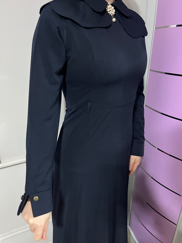Düğmeli, yakalı ve uzun kollu koyu lacivert elbise, sentetik kumaştan üretilmiş. Ofis için uygun, klasik ve gotik tarzı bir arada sunar.