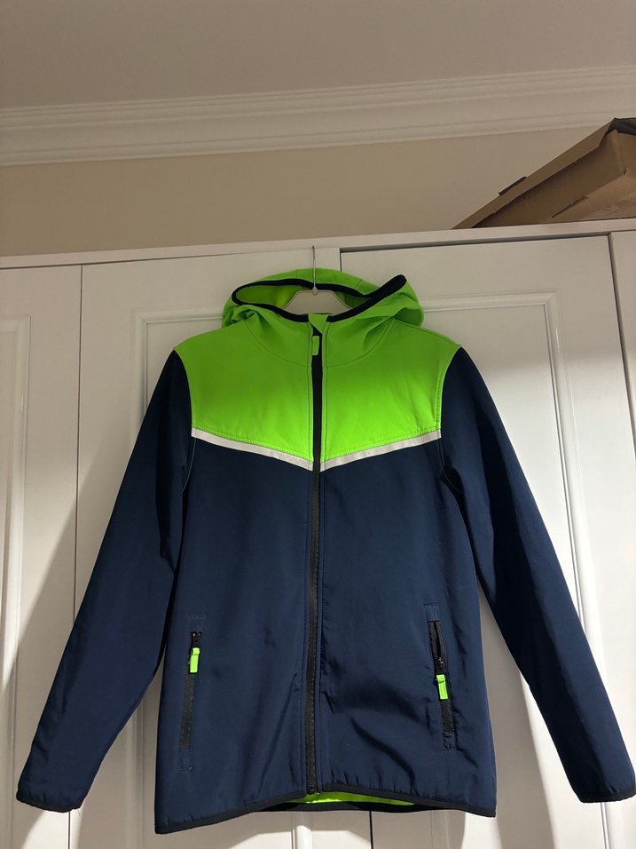 Fermuarlı ön ve cepleri, kesik yaka ve kapüşonuyla, koyu lacivert ve canlı yeşil renklerde, sokak stilinde, yumuşak ve sıcak kumaştan erkek çocuk montu. 10-11-12-13 olur etiketi ekli
