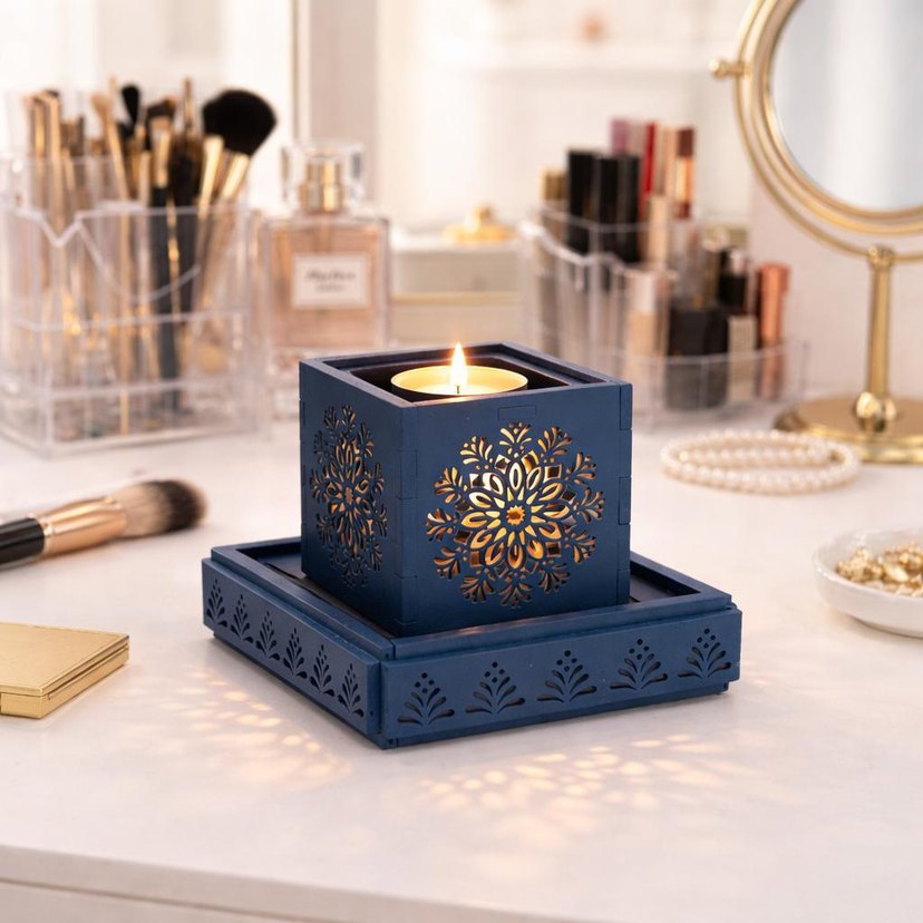 Koyu mavi renkte, detaylı oyma desenlere sahip ahşap mumluk. Dekoratif ışık yansımaları sağlar, tabanı ile birlikte gelir. ️