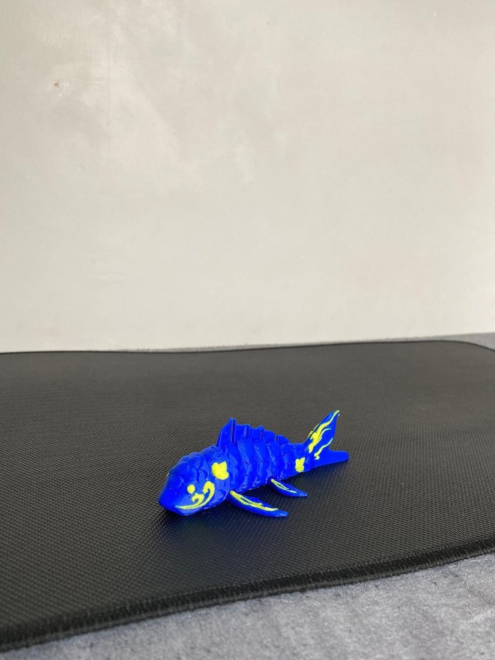 Koyu mavi renkte, sarı detaylı hareket edebilen esnek yapıda bir süs balığı