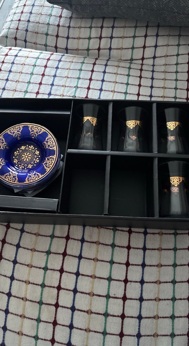 Koyu mavi renkli, altın desenli çay bardakları ve tabakları siyah kutuda sunulmuştur.