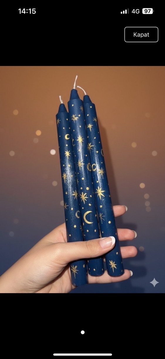 3lü fiyat . Koyu mavi renkte, altın renkli yıldız ve ay desenleriyle süslenmiş mum seti, sıcak bir atmosfer yaratmak için uygundur. ️