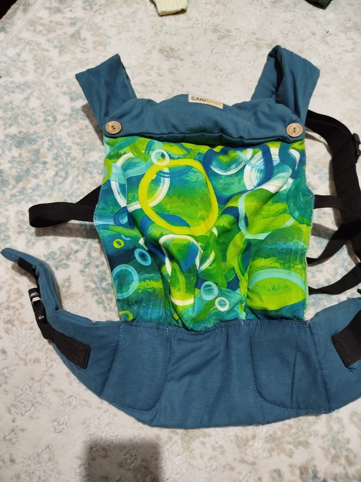 Canlı yeşil ve mavi kabarcık desenli, koyu mavi renkli, yumuşak dolgulu ve ayarlanabilir kayışlı bebek taşıyıcı.